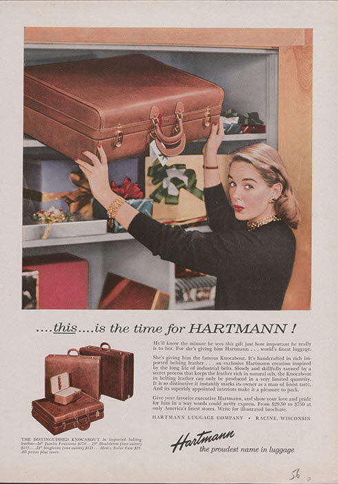 1956년 하트만의 벨팅 레더(belting leather) 가방 광고.