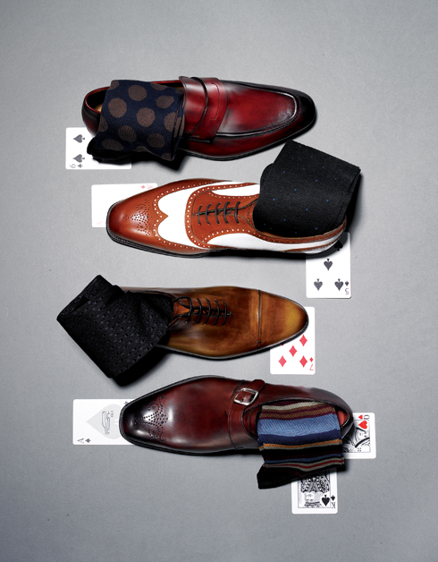 바짓단 아래로 슬쩍 보이는 양말은 그 남자의 패션 센스를 가늠하는 척도가 된다. 데님이나 치노 팬츠에만 프린트 양말을 매치할 수 있다는 고정관념만 버리더라도 양말 스타일링이 무궁무진하게 펼쳐진다. 도트나 스트라이프 등 프린트가 있는 양말은 톤 다운된 다크한 컬러를 선택하고, 프린트 없이 컬러만으로 포인트를 줄 때는 보색 컬러를 매치하는 것이 기본적이다. 수트에 매치하는 만큼 바지 컬러도 양말을 선택하는 결정적인 역할을 하는데, 팬츠와 같은 컬러에 톤만 다르게 하거나 한 단계 진한 색을 고르면 깔끔한 느낌을 줄 수 있다. 포켓 스퀘어나 부토니에의 컬러와 양말을 같은 컬러로 맞춰도 좋다. 페니 로퍼는 맨발에 신어도 멋스럽지만 날씨가 추워지기 시작하는 이맘때쯤부터는 휑해 보일 수 있으니 위트 있는 양말로 포인트를 줄 것. 클래식과 세미 캐주얼을 넘나드는 디자인인 만큼 잔잔한 물방울이나 커다란 도트, 스트라이프까지 프린트에 구애받지 않고 두루 어울린다. 앞코의 펀칭 장식이 특징인 윙 팁 슈즈에 아가일 체크무늬를 선택하면 영국의 신사를 떠올리는 클래식한 룩이 완성된다. 대신 같은 윙 팁 디자인이라도 투톤 컬러라면 전체적으로 복잡해 보일 수 있기에 단색 양말을 선택하는 것이 안전할 듯. 클래식 슈즈의 기본인 스트레이트 팁 슈즈에는 캐시미어나 얇은 골지로 소재나 디테일의 변화만 주는 것이 더욱 고급스러워 보이며, 끈 없는 구두 중에서도 가장 포멀한 느낌을 주는 몽크 스트랩 슈즈에는 알록달록한 스트라이프 패턴이나 화려한 꽃 무늬 등의 양말로 젊고 화려하게 연출할 것을 권한다.