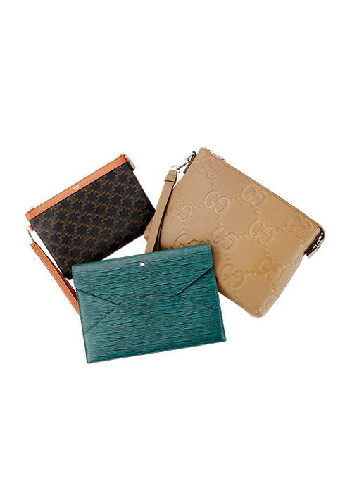 송아지가죽 소재에 탈착 가능한 스트랩으로 편의성을 더한 브라운 컬러 스트랩 파우치 86만원 셀린느. 문의 1577-8841.