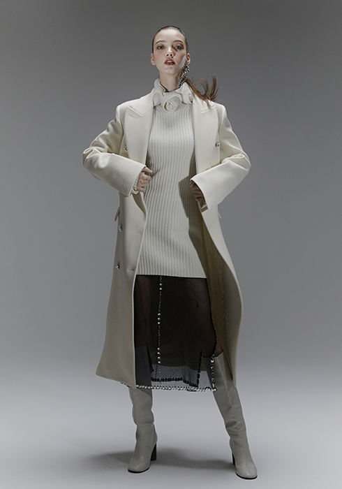 울 소재의 화이트 컬러 더블브레스트 코트, 울 소재의 플라워 디테일 화이트 니트 모두 가격 미정 블루마린. 라인스톤 장식 미디스커트 3백55만원 프라다. 가죽 소재의 화이트 컬러 롱부츠 가격 미정 레이첼 콕스. 아크릴 & 글라스 소재의 이어링 가격 미정 드리스 반 노튼.