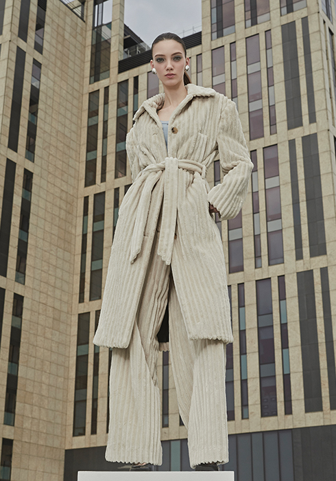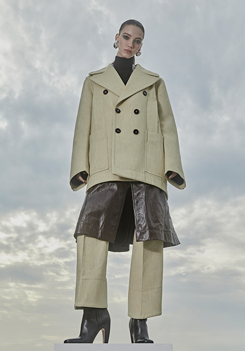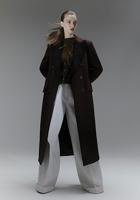 버진 울 소재의 브라운 컬러 더블브레스트 코트 3백만5천원 토즈. 재생 폴리에스터 소재의 브라운 컬러 니트 톱 32만8천원 메종 마레. 화이트 컬러 와이드 팬츠 가격 미정 막스마라.
