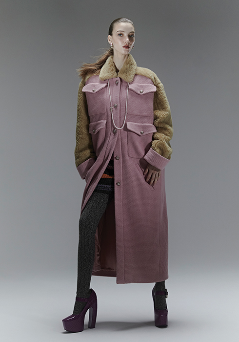 모헤어 소재의 패턴 코트 가격 미정 드리스 반 노튼. 폴리아미드 소재의 바이올렛 컬러 카디건 54만8천원, 버진 울 & 리넨 소재의 바이올렛 컬러 스커트 46만8천원 모두 잉크. 카프 스킨 소재의 브라운 컬러 부츠 3백16만원 루이 비통. 크리스털 장식 나파 가죽 초커 가격 미정 미우 미우.