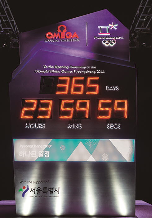 1988년 서울 올림픽 이후 30년 만에 개최되는 올림픽, 게다가 동계 대회는 처음이다. 평창 올림픽은 지난 2011년 남아공 더반 IOC 총회에서 유치가 확정된 뒤 숨가쁘게 6년을 달려왔다. 3수 끝에 대회 유치를 확정한 만큼 성공 개최를 향한 뜨거운 의지와 열정으로 대회를 준비해왔다. 그동안 기울인 노력을 뒤돌아보는 동시에 올림픽이 다가오고 있음을 알리는 첫 번째 행사는 2017년 2월 8일 수요일 서울시청 앞 광장에서 열렸다. IOC 조정위원장 구닐라 린드버그와 이희범 평창 동계올림픽 조직위원을 비롯해 박원순 서울시장, 최문순 강원도지사, 그리고 유동훈 문화체육관광부 2차관, 오메가의 대표이자 CEO 레이날드 애슐리만, 그리고 서울시민과 강원도민이 함께했다. 2018 평창 동계올림픽을 딱 1년 앞둔 시점으로, 평창 동계올림픽 카운트다운 시계탑(오메가 타임키퍼) 제막식을 위한 행사였다. 무게 8톤, 높이 4.3m의 올림픽 카운트다운 시계탑은 평창 동계올림픽과 패럴림픽 대회가 끝나는 2018년 3월 20일까지 서울시청 앞 광장에 자리할 예정이다. 오메가의 대표이자 CEO 레이날드 애슐리만은 “오메가는 이번에 28번째 공식 타임키퍼로 참여한다. 최고의 경기를 위해 피땀 흘려 연습하는 선수들을 위해 타임키핑 정확도를 높이는 것이 오메가의 사명”이라며 오메가의 오랜 타임키핑 역사에 자부심을 보였다. IOC 조정위원장 구닐라 린드버그는 “그간 타임키핑 기술은 올림픽이 열릴 때마다 빠르게 발전해왔다”며 오메가가 운동경기 기록만 전담하는 오메가 타이밍이라는 계열사를 둘 정도로 초정밀 계측에 대한 연구를 아끼지 않은 데 감사를 표했다. 한편 지난 5월에는 오메가가 공식 올림픽 게임 타임키퍼로서 2032년까지 국제올림픽위원회(IOC)와 글로벌 파트너십을 연장한다고 발표했다. 1932년 올림픽과 인연을 맺은 이후 이번 계약으로 자그마치 ‘1백 년 인연’이라는 점에서 서로의 신뢰가 얼마나 두터운지 다시금 확인해주었다. 지금까지 올림픽에서 그랬듯 오메가는 평창에서도 새로운 타임키핑 기술을 소개할 예정이다. 어떤 신기술을 스포츠에 접목했을지, 오메가의 활약 또한 이번 올림픽 관전 포인트 중 하나다.