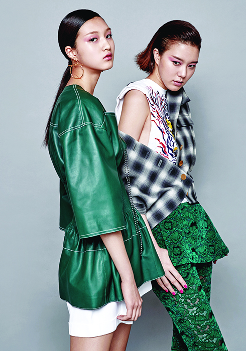 (왼쪽) 짙은 그린 컬러가 고급스러운 레더 소재 톱 가격 미정 에르메스. 골드 이어링 23만8천원 아이노. 화이트 쇼츠 1백10만원 마이클코어스 컬렉션.