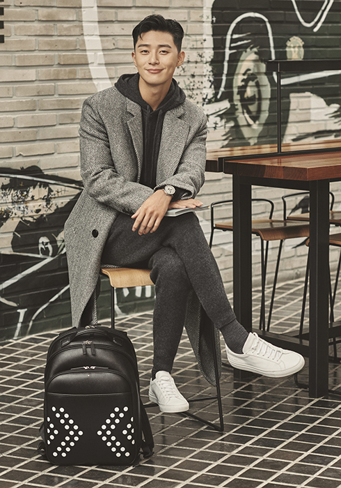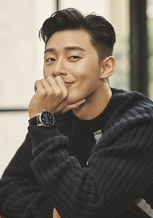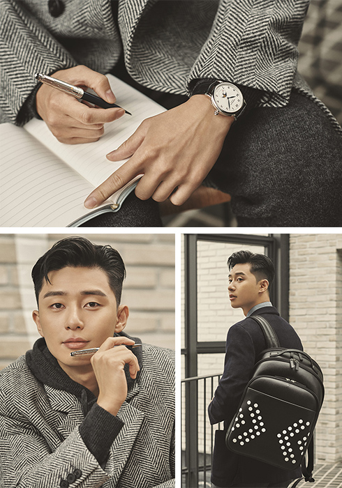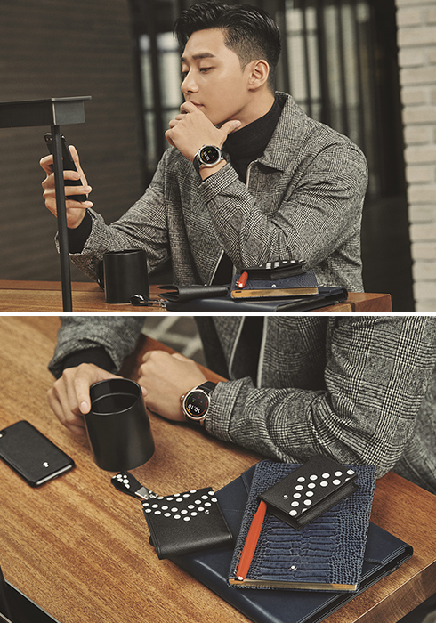 직경 42mm 스테인리스 스틸 케이스에 블랙 카프 스트랩을 매치한 ‘서밋 2’ 스마트 워치, 배우 박서준이 가장 좋아하는 패턴인 도트를 입힌 ‘몽블랑 X PSJ 캡슐 컬렉션’ 비즈니스 카드 홀더 24만원, 반지갑 6cc 37만원, 몽블랑 크로커다일 프린트 블루 바이올렛 컬러 노트 11만원 모두 몽블랑.