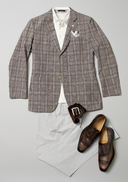 클래식한 체크 패턴을 입은 시어서커 재킷은 한여름 포멀한 옷차림을 위해 반드시 필요한 아이템이다. 땀 흡수가 빠르고 통기성이 좋아 하루 종일 상쾌한 착용감을 선사한다. 시어서커 재킷과 화이트 셔츠, 아이보리 팬츠, 스트레이트 팁 슈즈, 위빙 벨트 모두 빨질레리.