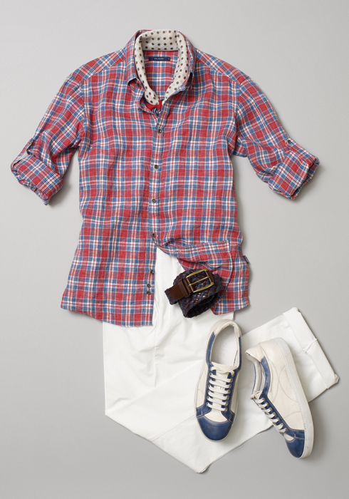 롤 업 소매로 제안하는 경쾌한 체크 패턴 리넨 셔츠는 여름철 옷차림에 활기를 불어넣는다. 화이트 팬츠를 매치하면 시원한 느낌을 더할 수 있다. 도트 무늬 스카프와 연출한 감각적인 스타일링을 참고할 것. 체크 리넨 셔츠, 화이트 팬츠, 위빙 벨트, 스니커즈 모두 빨질레리.