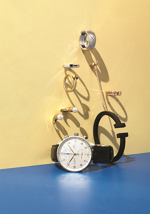 (위부터 시계 방향으로) 옐로 골드, 베이지 골드 등 다양한 컬러와 사이즈로 출시했다. 화이트 골드 미디엄 코코 크러쉬 링 4백만원대 샤넬 화인 주얼리. 잘 다린 깔끔한 셔츠 칼라에서 빛을 발하는 저스트 앵 끌루 카라 바 1백80만원 까르띠에. 매일 착용해도 질리지 않는 실용적인 디자인으로 아이코닉한 알파벳 T 모양을 살린 18K 로즈 골드 티파니 T 트루 와이드 링 1백90만원대, 블랙 코팅을 한 스틸 티파니 T 스퀘어 브레이슬릿 1백80만원대 모두 티파니. 지름 40.9mm의 스테인리스 스틸 케이스에 앨리게이터 스트랩을 매치했다. 가는 손목에도 매력적이라 남녀 모두에게 사랑받는 포르투기저 크로노그래프 9백75만원 IWC. 크리에이티브 디렉터 타쿤 파니치갈이 디자인한 뿔 형태가 매력적이다. 한쪽에만 포인트로 착용해도 멋스러운 리파인드 리벨리온 호른 이어링 2백75만원 타사키. 단순하고 평범한 못 모티브에서 독특한 아름다움을 이끌어낸 18K 옐로 골드 저스트 앵 끌루 링 2백70만원대 까르띠에. 2개의 떨어진 면을 이어주는 디자인으로 끊어질 수 없는 영원한 인연을 상징하는 리앙 에비당스 링 2백만원대 쇼메.