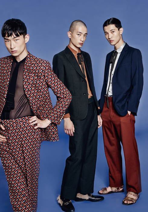 (가운데) 다크 그린 재킷과 팬츠, 오렌지 컬러 셔츠, 블랙 타이, 캥거루 퍼 블랙 로퍼 모두 구찌.