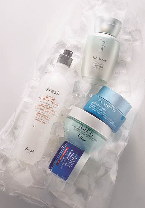 가장 간편하고 즉각적으로 피부 열을 식히는 방법은 ‘프레쉬 로즈 플로럴 토너’를 냉장고에 넣어 차갑게 만든 후 화장 솜에 묻혀 팩을 하듯 올려주는 것. 천연 장미수로 민감해진 피부를 빠르게 진정시키는 이 토너는 피부 유수분 밸런스를 맞추고 뛰어난 수딩 효과를 발휘해 미스트 대신 수시로 뿌려도 좋다(250ml 5만7천원대). 이와 함께 자외선 때문에 발생하는 외부의 열을 차단하고 피부 온도를 즉각적으로 내려주는 데이 크림을 눈여겨볼 것. SPF 30의 자외선 차단 기능을 갖춘 ‘설화수 소선보크림’은 편백나무 성분과 매실을 훈증한 오매 성분을 함유해 피부를 진정시키는 데 도움을 주고 자외선으로 인한 외부 열 자극으로부터 피부를 보호한다(50ml 15만원대). 바르는 즉시 시원한 쿨링 효과를 전달하는 크림도 서머 시즌 필수 아이템! ‘클라란스 하이드라-에센셜 쿨링 젤’은 바르는 즉시 피부에 상쾌함을 선사하는 쿨링 효과의 젤 텍스처 크림으로, 푸석하고 거칠어지기 쉬운 여름철 피부에 강력한 수분을 공급하는 것이 특징. 크림을 도톰하게 올려 수딩 팩처럼 사용하면 효과적이다(50ml 6만2천원). 시원한 소르베처럼 가볍고 촉촉한 젤 타입의 수딩 크림인 ‘디올 하이드라 라이프 프레쉬 하이드레이션 소르베 크림’은 물방울이 느껴질 정도로 촉촉한 수분감에, 발랐을 때 시원해지는 쿨링 효과가 달아오른 피부를 빠르게 진정시킨다(50ml 9만원대). ‘키엘 오일-프리 쿨링 수분 젤 크림’ 역시 쿨링 효과를 갖춘 멘톨 유도체 성분을 함유해 바르는 즉시 피부 온도를 낮춰주면서 시원하게 수분을 채우고 피지는 산뜻하게 케어해주는 수분 크림이다. 키엘의 핵심 성분인 빙하 당단백질 추출물과 사막 식물 추출물을 함유해 하루 종일 피부에 촉촉한 수분을 공급하니, 이제 야외 활동도 걱정 없다(50ml 3만9천원대).