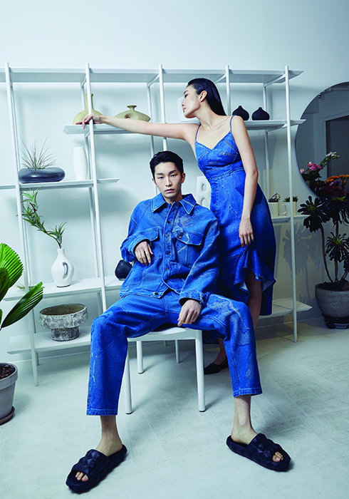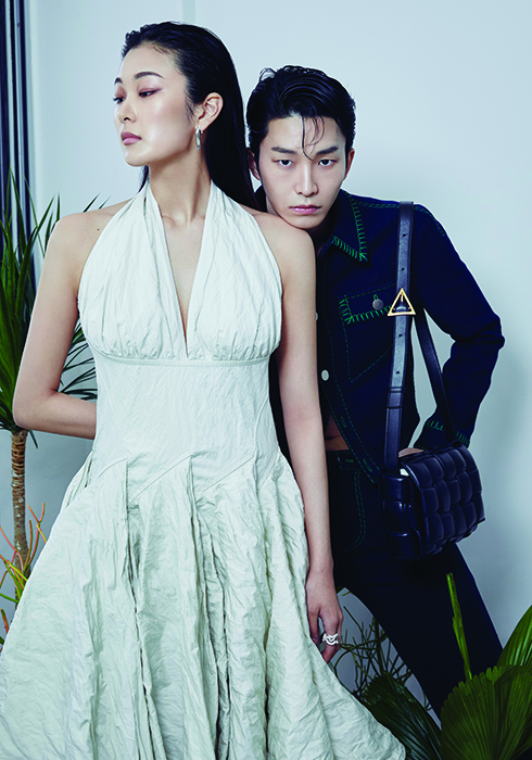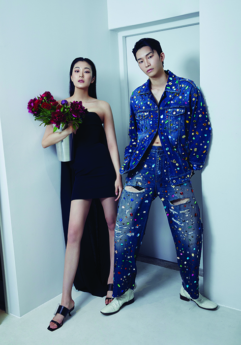 (여자) 다크 인디고 오가닉 데님 재킷 가격 미정 디올. 숄더 스트랩 장식 뷔스티에 드레스 가격 미정 에르메스. LV 아치라이트 샌들 가격 미정 루이 비통. |
