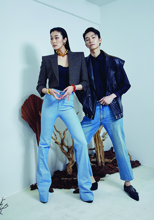 (남자) 오버사이즈 투 버튼 재킷 98만원, 화이트 오버사이즈 셔츠 49만원, 데님 팬츠 가격 미정 무홍. 블랙 메탈 장식의 웨스턴 부츠 가격 미정 셀린느 옴므 by 에디 슬리먼. |
