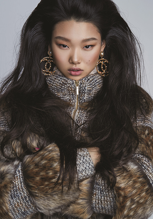 퍼 트리밍 재킷, 니트 드레스, 골드 이어링 모두 가격 미정 샤넬.