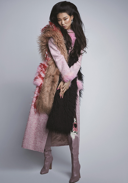 핑크색 퍼 트리밍 코트 6백38만원, 스커트 1백8만원 모두 블루마린.