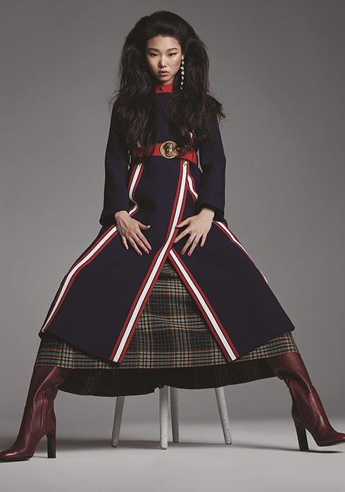 네이비 컬러 코트 가격 미정, 체크 스커트 2백35만원 모두 구찌.