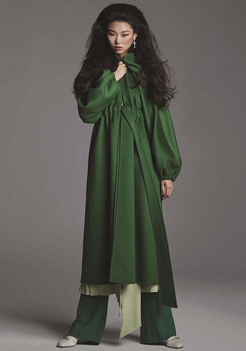 그린 후드 코트 7백73만원, 이너로 입은 드레스 7백92만원, 그린 팬츠 1백33만원 모두 발렌티노.