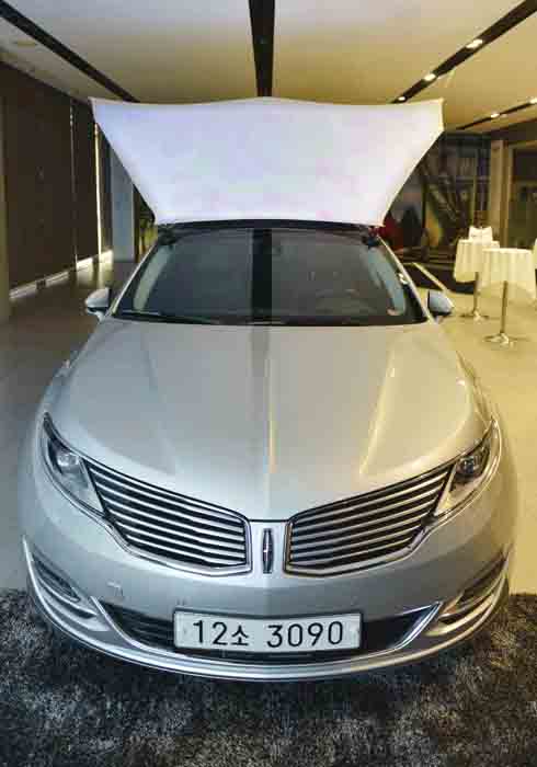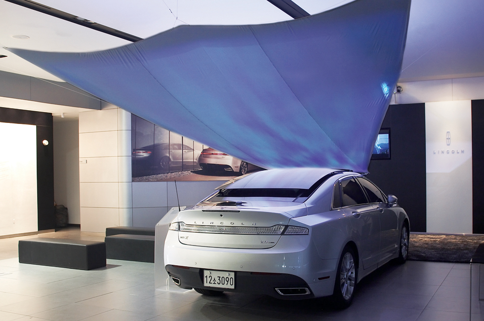 이러한 배경에서 볼 때, 지난해 서울 신사 전시장에서 12월 16일부터 29일까지 진행됐던 링컨의 아트 컬래버레이션 프로젝트 ‘리이매진’이 선택한 3명의 국내 아티스트는 발군의 조합이었다. 이미지를 적용하는 방식이나 시각에서 혁신을 일삼아온 포토그래퍼 한성필, 사진 조각이라는 분야를 개척해 세계적인 아티스트로 자리매김한 권오상, 그리고 기술과 예술의 조합을 앞세워 재기발랄한 미디어 아트로 주목받고 있는 에브리웨어. 일단 이들의 컬래버레이션 결과물이 반갑고 고무적인 것은 차체에 물방울이나 줄무늬를 입히는 식 등 이쪽 분야에서 다소 식상해진 ‘아트 카’ 방식을 차용하지 않았기 때문이다. 저마다의 분야에서 한계를 거부하고 경계를 넘나드는 사고를 작품 세계에 반영해온 아티스트답다고나 할까. 그래서 브랜드와의 ‘궁합’이 더욱 돋보였다. 링컨의 야심작 MKZ를 2주간 몸소 주행한 경험을 바탕으로 떠오른 영감을 발산한 이들은 이구동성으로 “커다란 자유를 느꼈다”며 덕분에 스스로의 창조 여정에서도 새로움을 추구할 수 있었던 것 같다고 말했다. 물론 ‘자동차’를 잊지는 않았다. 세 그룹 모두 차체에 손길이 닿지 않았을 뿐이지 자동차이기에 의미를 품을 수 있는 재치 어린 요소를 창의적으로, 그리고 상당히 자연스럽게 저마다의 작품에 반영했다. 이 글에서 작품을 소개하는 순서는, 굳이 전시장을 찾지 않더라도 자연스럽게 시선이 닿을 수 있는 건물 바깥부터 시작했다. 첫 번째로 등장하는 한성필 작가의 표현을 빌리자면 그의 작품인 건물 외벽을 감싸는 커다란 가림막은 전시장 내부로 들어가 ‘공간과의 대화’를 접하게 만드는 유도체이니까 말이다.