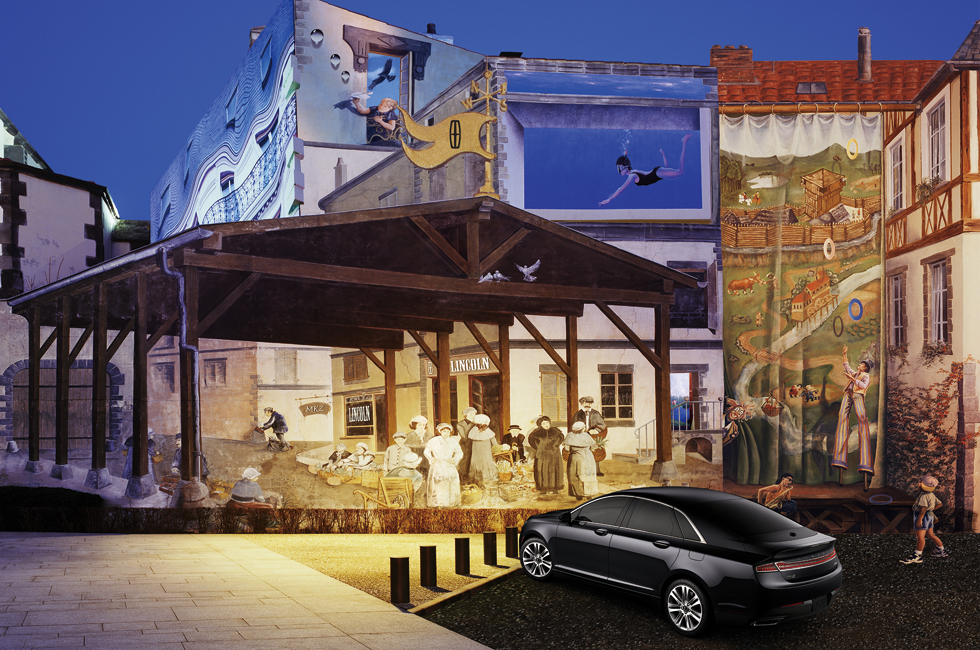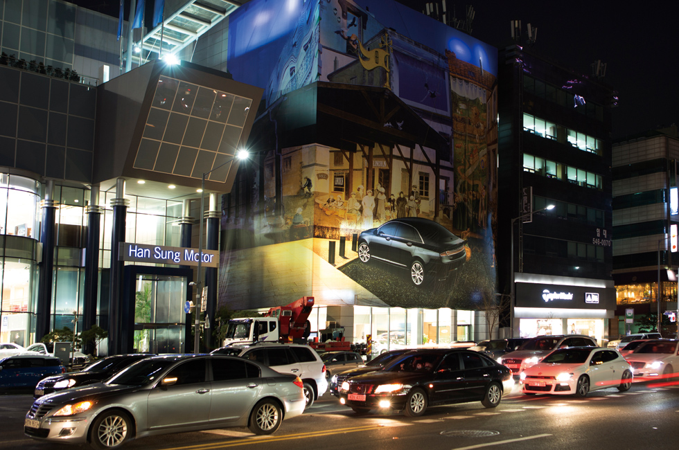 흔히들 선호하듯 자동차의 ‘래핑(wrapping)’을 시도하는 대신 건물 전체를 감싸버리는 대형 파사드(facade)를 설치한 건 아무래도 ‘신의 한 수’였다. 거리를 걷는 행인은 물론이고 자동차를 타고 바삐 지나가는 이들의 눈길까지 절로 사로잡기 때문이다. 아무리 괜찮은 전시회라도 ‘모객’이 안 되면 무슨 소용이랴. 링컨 전시장 건물은 번잡한 도심의 풍경이 짙게 드리운 서울 강남의 도산 사거리 모서리에 자리 잡은 터라 중세 유럽의 시장을 재현했다는 한성필 작가의 고풍스러운 사진은 더욱 시선을 잡아끈다. 동화에 등장하는 아름다운 그림처럼 보이지만 콜라주 형식의 사진이란다. 이 건물이 위치한 사거리에는 온갖 종류의 차들이 쉴 새 없이 지나다니는 터라, 환하게 켜진 링컨 MKZ의 헤드라이트가 시장을 비추는 사진 속 광경은 한결 이색적으로 보인다. 과거에는 논밭으로 뒤덮여 있었지만, 이제는 첨단 문명의 상징이 된 강남의 역사적 맥락이 스며든 도산 사거리에 전통과 현대의 이미지가 교차하는 공간을 창출하고 싶었다고 한 작가는 설명한다. 상상과 물리적인 공간의 경계를 가림막 하나로 허무는 것이다. 실재와 가상의 간극을 허무는 ‘비주얼 일루셔니스트’라는 별칭을 가진 아티스트다운 의도다. 사실 건물에 마치 그림 같은 느낌의 사진을 활용한 파사드를 창조하는 건 한 작가의 주특기이다.하지만 이번 프로젝트는 그를 새로운 난관에 부딪히게 만들기도 했다. “지지할 곳이 마땅치 않은 통유리로 된 건물에 천 가림막을 설치하는 작업 자체가 도전이었어요. 게다가 ㄴ 자로 된 구조 때문에 ‘골바람’이 들어와 천의 일부가 부풀어버리기도 했죠(웃음).” 아무리 세심한 실측을 바탕으로 시뮬레이션 작업을 해도 결국 예기치 못한 장애물이 생기기 마련이라고 말하는 그는 전시회 개막일 전날, MKZ 프로젝트를 위한 가림막 설치 작업을 하다 밤을 새우다시피 했지만 이러한 난관도 극복하는 ‘노하우’가 생겨 보람이 크다며 흐뭇해했다.