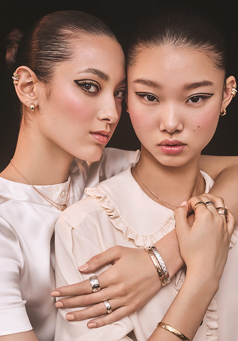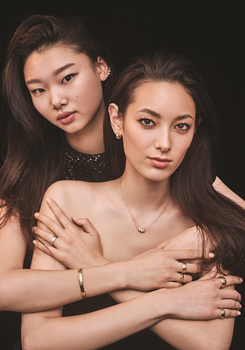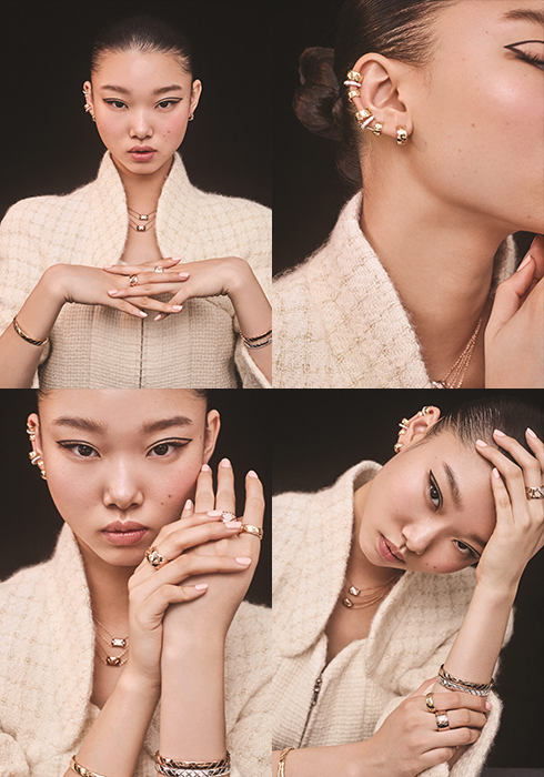 옐로 골드와 다이아몬드 세팅의 화이트 골드 이어링, 옐로 골드 이어링, 레이어링해 연출한 베이지 골드 소재 솔리드 및 다이아몬드 세팅 버전의 네크리스, 오른손 중지의 베이지 골드 미디엄 링, 오른쪽 손목의 옐로 골드 브레이슬릿, 왼손 중지의 베이지 골드 다이아몬드 미디엄 링, 왼손 검지의 옐로 골드 스몰 링, 왼쪽 손목의 베이지 골드와 화이트 골드 다이아몬드 브레이슬릿 모두 코코 크러쉬 가격 미정 샤넬 화인 주얼리.