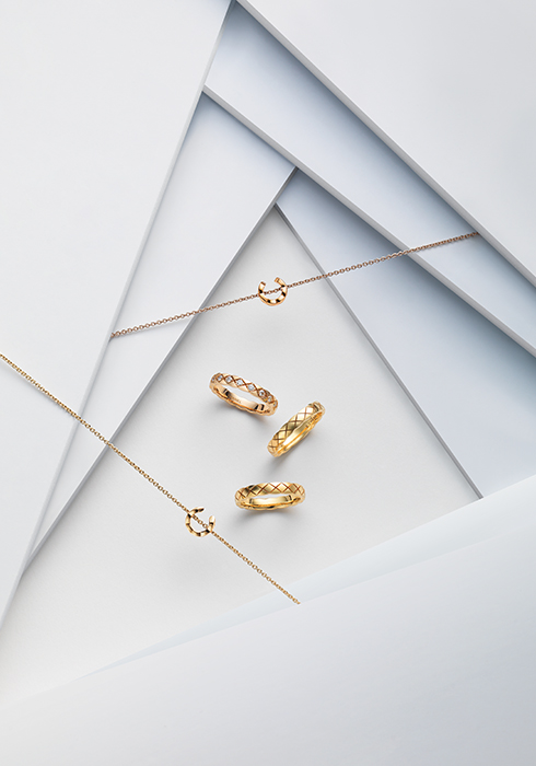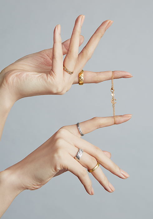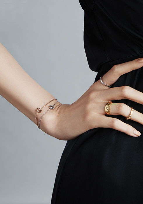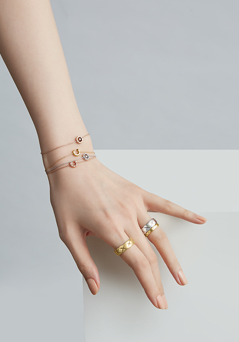 총 0.03캐럿의 라운드 컷 다이아몬드를 O 형태의 펜던트 중앙에 정교하게 세팅한 18K 베이지 골드 소재와 18K 화이트 골드 소재의 코코 퀼팅 브레이슬릿, 약지에 착용한 18K 옐로 골드 소재의 코코 크러쉬 스몰 링, 총 0.37캐럿의 18개 라운드 컷 다이아몬드를 세팅한 18K 옐로 골드 소재의 코코 크러쉬 다이아몬드 미니 링, 검지에 착용한 간결하고 절제된 멋을 전하는 18K 화이트 골드 소재의 코코 크러쉬 미니 링 모두 가격 미정 샤넬 화인 주얼리.