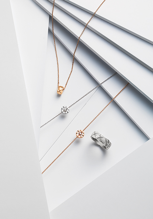 체인 길이를 조절할 수 있고 퀼팅 모티브 펜던트가 포인트인 18K 베이지 골드 소재의 코코 크러쉬 네크리스, O 모양 로고 펜던트 안에 0.03캐럿의 라운드 컷 다이아몬드를 세팅한 18K 화이트 골드 소재와 18K 베이지 골드 소재의 퀼팅 브레이슬릿, 총 0.18캐럿의 31개 라운드 컷 다이아몬드를 촘촘하고 정밀하게 세팅해 고급스러움을 선사하는 18K 화이트 골드 소재의 코코 크러쉬 다이아몬드 스몰 링 모두 가격 미정 샤넬 화인 주얼리. 문의 080-805-9628, chanel.com