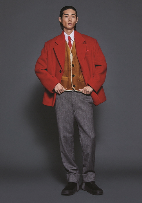풍성한 컬러풀 재킷과 루스 팬츠의 매치가 시크하다. 레드 재킷, 스웨이드 베스트, 화이트 셔츠, 그레이 팬츠, 블랙 부츠, 레드 타이 모두 가격 미정 프라다.