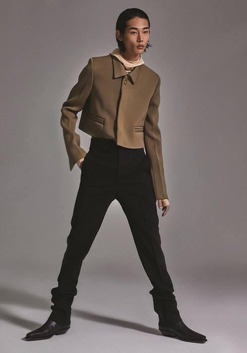 쇼트 재킷으로 유니크한 스타일을 완성했다. 브라운 블루종 가격 미정, 베이지 후드 톱 1백60만원, 블랙 팬츠 가격 미정, 블랙 부츠 1백58만5천원 모두 보테가 베네타. |