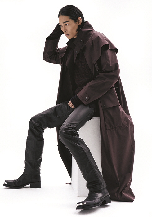 슬릭한 캐주얼 룩과 볼륨이 풍성한 트렌치코트의 매치. 버건디 트렌치코트, 니트 톱, 레드 라텍스 터틀넥 풀오버, 블랙 레더 팬츠, 블랙 부츠 모두 가격 미정 지방시.