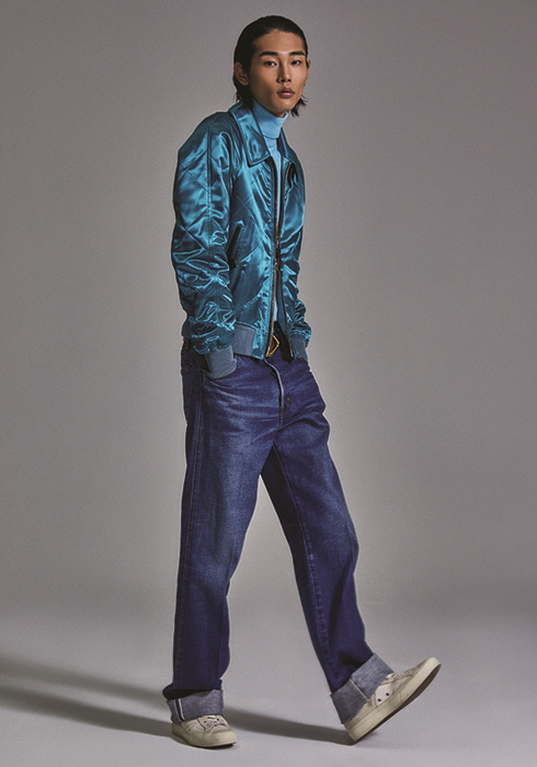 복고풍의 럭셔리 스트리트 캐주얼 스타일. 블루 새틴 블루종 4백50만원, 터틀넥 톱 가격 미정, 데님 팬츠 1백20만원, 브라운 레더 벨트 1백44만원, 레더 스니커즈 가격 미정 모두 톰 포드.