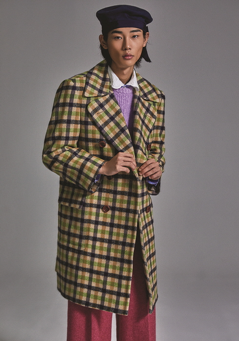 레트로풍 체크무늬 피코트로 연출한 클래식 캐주얼 룩. 체크 코트 5백50만원, 라벤더 니트 톱 1백55만원, 셔츠 가격 미정, 핑크 팬츠 1백5만원, 네이비 베레 가격 미정 모두 구찌.