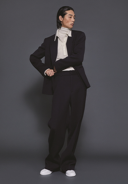 블랙 앤 화이트 수트의 캐주얼한 변신. 네이비 더블 재킷 2백만5천원, 화이트 저지 셔츠 64만5천원, 터틀넥 풀오버 1백7만5천원, 네이비 팬츠 1백13만5천원, 화이트 스니커즈 가격 미정 모두 토즈. |
