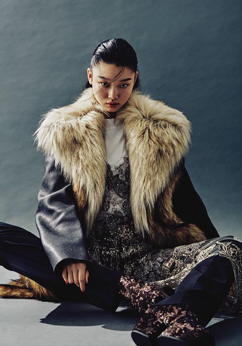 퍼 코트 가격 미정 포츠 1961. 릴리 패드 자수의 비대칭 톱, 블랙 컬러 팬츠 모두 가격 미정 알렉산더 맥퀸. 브라운 컬러 스팽글 장식 부츠 가격 미정 프라다. |