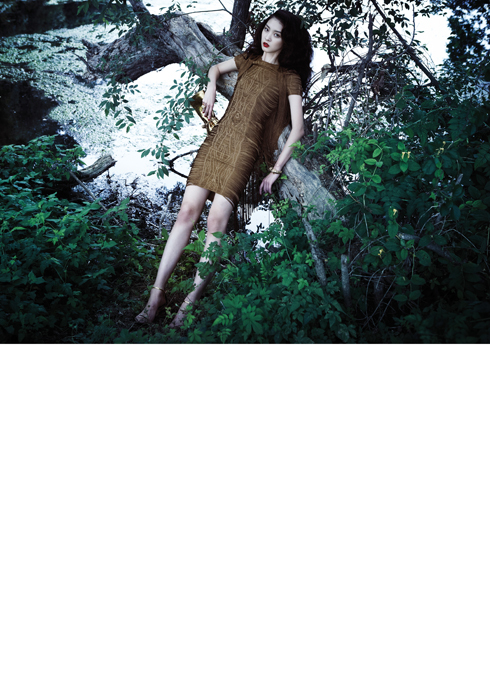 브라운 태슬 원피스 6백만원대, 골드 말리카 클러치 가격 미정 모두 구찌. 기린 모티브 골드 스트랩 슈즈 2백28만원 루이 비통. 호랑이 모티브 뱅글 68만원 블루마린. 볼드한 골드 링 30만원대 미네타니 by 스와로브스키 엘리먼츠.