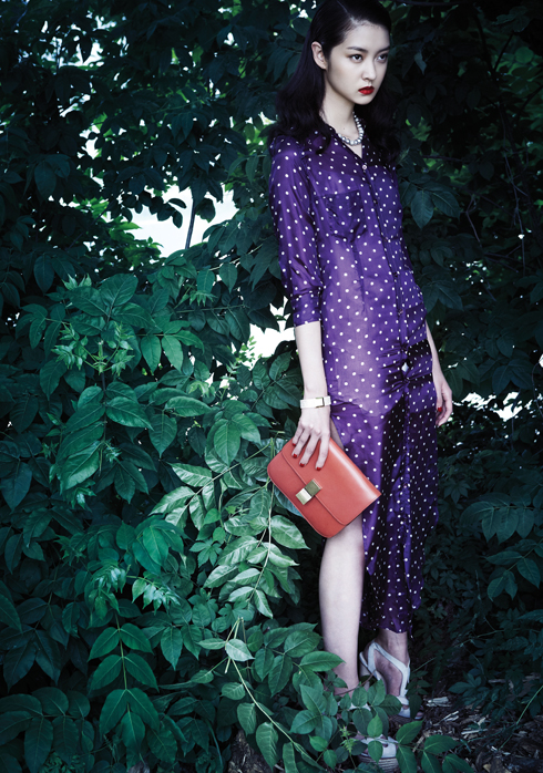 퍼플 도트 패턴 드레스 1백9만원 폴 스미스. 화이트 스트랩 슈즈 1백만원대 프라다. 그레이 진주 네크리스 87만원 미네타니 by 스와로브스키 엘리먼츠. 크리스털 시계 1백50만원대 스와로브스키. 오렌지 컬러 클러치 5백50만원 셀린.