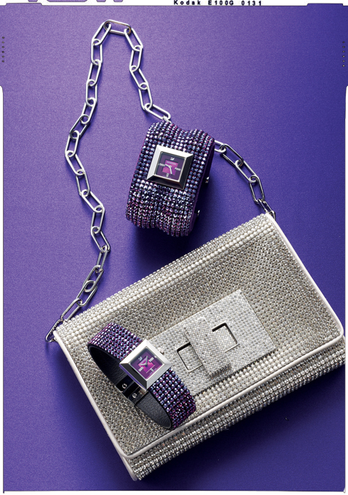 바이올렛 컬러 스와로브스키 세팅이 화려한 엘리스(Elis) 뱅글 워치와 미니 워치.