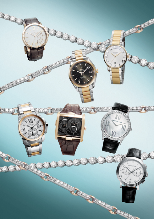까르띠에의 강력한 브랜드 아이덴티티를 느낄 수 있는 칼리브 드 까르띠에 골드와 스틸 콤비 워치. 1천4백만원대 까르띠에. (워치를 둘러싸고 있는 심플한 디자인의 다이아몬드 줄은 티파니의 빅토리아 네크리스, 골드와 플래티넘이 체인처럼 연결되어 있는 줄은 다미아니의 스타라이트 브레이슬릿이다)