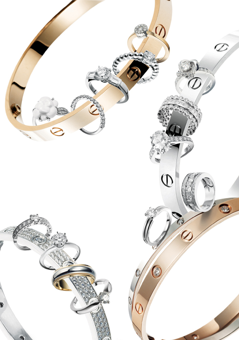 마치 2개의 밴드 링을 매치한 것처럼 보이는 고드론 브라이덜 링. 0.5캐럿 다이아몬드를 세팅했다. 1천만원대 부쉐론. (반지와 함께 세팅한 커다란 라운드 모티브는 모두 까르띠에의 러브 브레이슬릿이다)