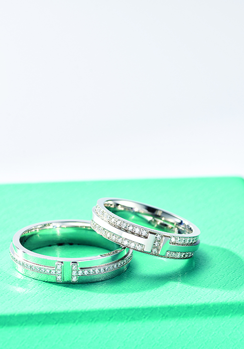 세계적으로 큰 반향을 불러일으킨 티파니 T 컬렉션 링의 두께를 줄여 더 심플하게 연출할 수 있는 티파니 T 투 내로우 커플 링. 18K 화이트 골드 소재에 T 모티브를 중심으로 다이아몬드를 세팅한 방법에 따라 다른 느낌을 자아낸다. 모두 티파니. |