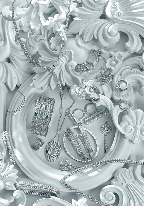 뱀에게서 영감을 받은 세르펜티 아이즈 온 미 컬렉션 브레이슬릿과 링, 네크리스. 육각 형태의 비늘 패턴을 새롭게 고안하고 에메랄드로 뱀의 강렬한 눈을 표현했다. 모두 불가리. 다이아몬드로 네 개의 꽃잎을 표현한 코스모스 네크리스 반클리프 아펠. 불가리 로고를 강조한 비제로원 컬렉션 브레이슬릿 불가리. 못에서 영감을 얻은 저스트 앵 끌루 더블 브레이슬릿. 6백24개의 다이아몬드를 세팅해 더욱 화려하다. 다이아몬드를 풀 파베 세팅한 러브 브레이슬릿. 2.45캐럿의 다이아몬드를 세팅했다. 까르띠에. 마키즈 컷 다이아몬드로 꽃잎을 형상화한 빅토리아 키 펜던트. 플래티넘에 다이아몬드를 정교하게 세팅했다. 티파니. 진주를 일렬로 늘어놓은 화이트 골드 바에 다이아몬드를 세팅해 더욱 볼드한 느낌의 밸런스 파베 링, 나란히 늘어선 진주에 0.5캐럿 다이아몬드를 세팅한 밸런스 솔로 링 모두 타사키.