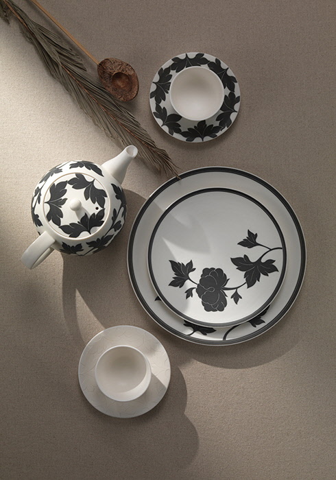 황제의 꽃, 부귀영화, 공명을 상징해 조선시대 왕실에서 즐겨 사용한 문양인 목단(모란)의 아름다움을 담은 ‘헤리티지 목단’ 컬렉션. 도자 장인이 백자에 박지 기법으로 조각, 전통 수공 도자기 특유의 우아함을 강조했다. (위부터 시계 방향으로) 낮은 찻잔과 찻잔 받침(현玄) 25만원, 디저트 접시 17호(현玄) 25만원, 디저트 접시 22호(현玄) 30만원, 낮은 찻잔과 찻잔 받침(백白) 25만원, 다관(현玄) 49만원 모두 헤리티지 목단 컬렉션 광주요. 문의 02-400-9939