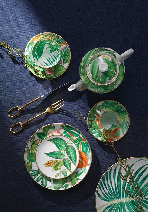포슬린 페인터 나탈리 롤랑위켈(Nathalie Rolland-Huckel)의 손을 통해 식물의 싱그러운 아름다움을 생동감 넘치게 재현한 ‘파시폴리아(Passifolia)’ 컬렉션. 자연의 다양성, 독창성, 관대함에 대한 찬가의 의미를 담았다. (왼쪽 위부터 시계 방향으로) 티 컵과 소서, 티포트, 커피 컵과 소서, 디너 플레이트, 디저트 플레이트, 사이드 플레이트 모두 파시폴리아 컬렉션으로 가격 미정, 골드 컬러 디너 포크와 디너 나이프 가격 미정 모두 에르메스. 문의 02-542-6622