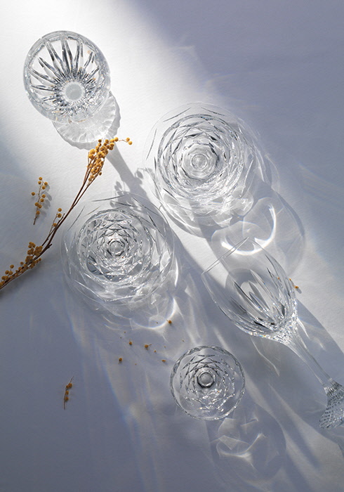 볼 아래쪽부터 기둥을 거쳐 글라스 받침까지 장인의 섬세한 손길을 느낄 수 있는 베벨 컷 주피터 글라스 35만원, 여러 개의 면으로 정교하게 깎아 빛의 투과가 만들어내는 아름다움을 만끽할 수 있도록 한 스윙 볼 15만원, 스윙 볼 아래 세팅한 투명한 크리스털 스윙 플레이트15만원, 왼쪽 상단과 동일한 모델의 주피터 글라스 35만원, 스윙 스몰 볼 25만원(2개 세트), 스윙 스몰 볼과 그 아래 디스플레이한 아코어 플레이트 15만원 모두 바카라. 문의 02-3448-3778