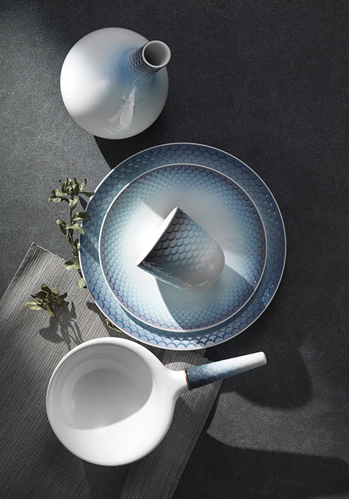 1892년 처음 선보인 시걸(Seagull) 라인에서 영감을 얻은 ‘하우(HAV)’ 컬렉션. 덴마크어로 ‘바다’를 뜻하는 하우 컬렉션은 총 아홉 가지 도자기로 구성, 물고기 비늘 모양 장식과 푸른빛의 에어 브러시 페인팅으로 구현한 독창적인 디자인이 돋보인다. (위부터) 카라페 39만원, 터말 머그 15만9천원, 지름 22cm의 플레이트 14만8천원, 지름 27cm의 플레이트 18만원, 하이브리드 볼 59만원 모두 하우 컬렉션 로얄코펜하겐. 문의 02-749-2002