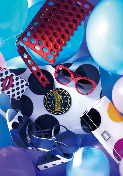 부드러운 송아지가죽 소재의 펀칭 장식 포리 파우치. 16.5X10cm, 가격 미정 미우미우. 레트로 무드가 느껴지는 도트 선글라스 31만원 돌체앤가바나. 큼지막한 네이비 도트 패턴과 로고 와펜이 유니크한 클러치. 30X24cm, 29만원 겐조. 컬러 도트 프린트로 포인트를 준 미스 비브 티셔츠 러브 컬렉션 장지갑 1백40만원대 로저 비비에. 선명한 네온 블루 컬러와 도트 무늬가 세련된 스트랩 샌들 1백26만원 펜디. 입술 모티브와 도트 패턴이 어우러진 스마트폰 케이스 3만9천원 애시드 & 스터드.