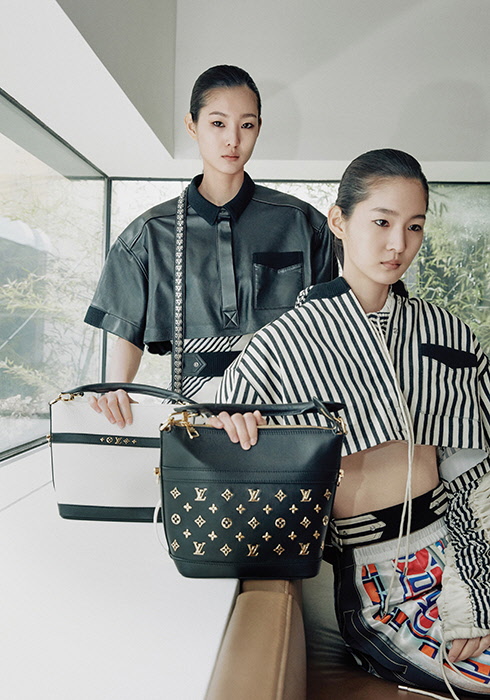 (왼쪽) 박시 쇼트 슬리브 레더 톱 9백52만원, 스트라이프 슬리브리스 톱 가격 미정, 스테이트먼트 슬로건 버뮤다 쇼츠 3백3만원, 블랙 컬러 메탈릭 모노그램 장식의 크루저 PM 백 6백71만원 모두 루이 비통.