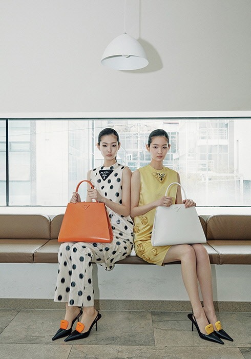 (왼쪽) 도트 무늬의 타프타 드레스 3백14만원, 도트 무늬의 타프타 팬츠 3백32만원, 블랙 레더 & 오렌지 나일론 슬링백 힐 가격 미정, 오렌지 브러시드 가죽 핸드백 가격 미정 모두 프라다.