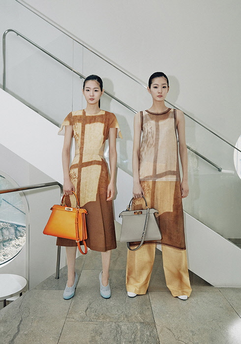 (오른쪽) 옐로 프린트 실크 드레스 3백만원대, 화이트 메시 저지 톱 가격 미정, 옐로 리넨 팬츠 가격 미정, 화이트 레이스 펌프스 1백만원대, 베이지 컬러 피카부 아이씨유 미디엄 5백만원대 모두 펜디.