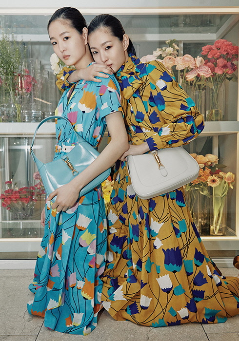 (왼쪽) 블루 컬러 플라워 프린트 드레스 4백20만원, 민트 컬러 재키 1961 스몰 호보 백 2백86만원 모두 구찌.