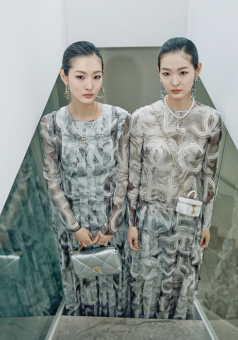 (왼쪽) 프린트 모슬린 소재 드레스, 골드 메탈 소재 이어링, 네크리스, 메탈라이즈드 램 스킨 소재 샤넬 19 백 모두 가격 미정 샤넬.