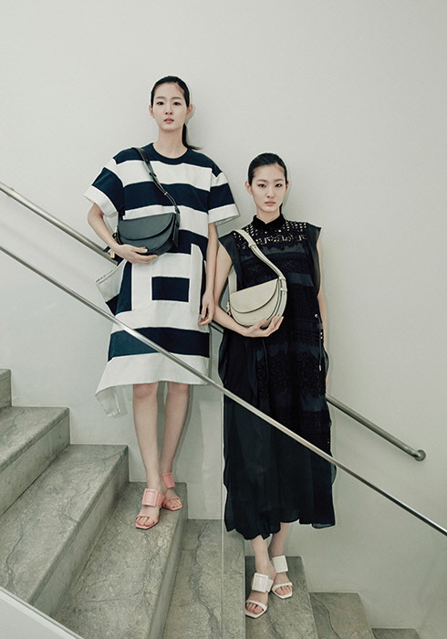 (왼쪽) 블랙 & 화이트 스트라이프 드레스 79만원 사카이. 핑크 웨지 뮬 1백23만원 로저 비비에. 블랙 컬러 시에라 플랩 숄더백 35만8천원 조이 그라이슨.
